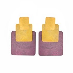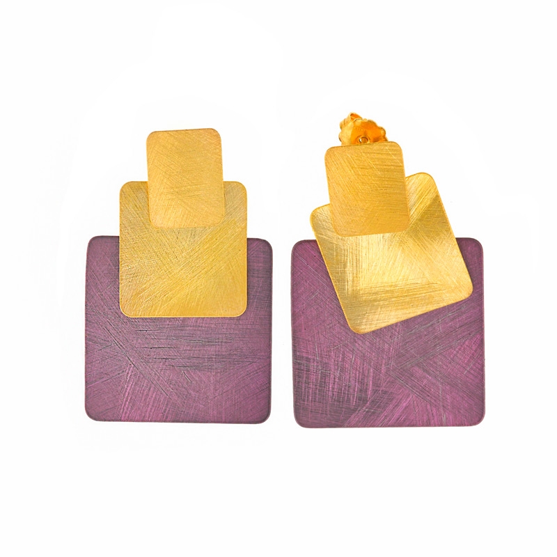 Formado por tres cuerpos de forma geométricas (cuadrados), están terminado en mate cepillado; cierre de palillo con tuerca a presión. Parte morada con un barniz hipoalergénico que da el toque de color.