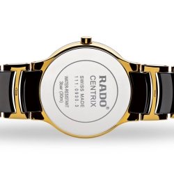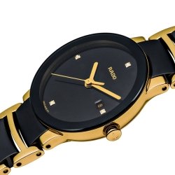 En particular este reloj Rado Centrix de mujer es de acero chapado en oro amarillo y cerámica de alta tecnología de color negro, de 3 agujas y calendario a las 3, en una caja de acero inoxidable de 28 mm de diámetro y esfera en negro. En ella se distribuye 4 pequeños diamantes de un peso total de 0,009 quilates. El cristal es de zafiro lo que lo hace más resistente a los arañazos del uso diario.